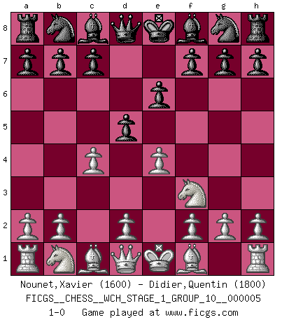 Last move : 1-0 2008 August 19 18:30:13 [Event "FICGS__CHESS__WCH_STAGE_1_GROUP_10__000005"] [Site "FICGS"] [Date "2008.07.08"] [Round "1"] [White "Nounet,Xavier"] [Black "Didier,Quentin"] [Result "1-0"] [WhiteElo "1600"] [BlackElo "1800"] 1.e4 e6 2.Nf3 d5 3.c4 1-0 This chess game has been lost on time (started : 2008.07.08 16:25:19) French defense Player White won this chess game. Follow this game move after move (download)Pawns: they are the soul of this game, they alone form the attack and defense. (Philidor) Wenn Schach ein enormer Dschungel ist, der seine Myriaden von Geheimnissen nicht preisgeben will, dann sind Computer die Kettensägen einer gewaltigen ökologisch unsensiblen Nutzholzfirma. (Nigel Short) Yo nunca en mi vida he jugado la Defensa Francesa, que viene siendo la más aburrida de todas las Aperturas. (Wilhelm Steinitz) Les Echecs représentent une sphère d'idées créatrices basée sur la volonté des deux protagonistes. (Smyslov) A generalist learns less and less about more and more until he knows nothing about everything. (Author unknown)