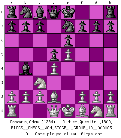 Last move : 1-0 2008 August 18 6:22:13 [Event "FICGS__CHESS__WCH_STAGE_1_GROUP_10__000005"] [Site "FICGS"] [Date "2008.07.08"] [Round "1"] [White "Goodwin,Adam"] [Black "Didier,Quentin"] [Result "1-0"] [WhiteElo "1234"] [BlackElo "1800"] 1.e4 e6 2.d4 d5 3.Nc3 Bb4 4.e5 Ne7 5.Bd2 1-0 This chess game has been lost on time (started : 2008.07.08 16:25:19) French : Winawer, Advance variation Player White won this chess game. Follow this game move after move (download)Chess is not like life... it has rules ! (Mark Pasternak) Capablanka war das größte Genie der Schachgeschichte! Aber denken sie nicht er habe nichts vom Schach verstanden. Er wusste nur soviel wie er wissen musste um seine Ziele zu erreichen. (Mikhail Moiseyevich Botvinik) Yo he agregado estos principios a la ley: pongan los Caballos en acción antes de que los dos Alfiles sean desarrollados. (Emanuel Lasker) Psychologiquement, tu dois avoir confiance en toi même, mais cette confiance doit être basée sur des faits. (Robert Fischer) Only sick music makes money today. (Friedrich Nietzsche)