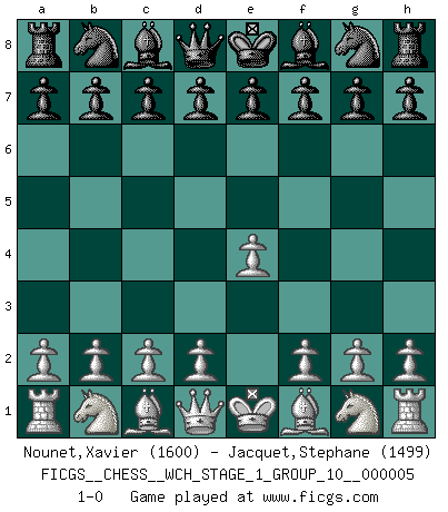Last move : 1-0 2008 August 10 5:35:25 [Event "FICGS__CHESS__WCH_STAGE_1_GROUP_10__000005"] [Site "FICGS"] [Date "2008.07.08"] [Round "1"] [White "Nounet,Xavier"] [Black "Jacquet,Stephane"] [Result "1-0"] [WhiteElo "1600"] [BlackElo "1499"] 1.e4 1-0 This chess game has been lost on time (started : 2008.07.08 16:25:19) King's pawn Opening Player White won this chess game. Follow this game move after move (download)One of these modest little moves may be more embarrassing to your opponent than the biggest threat. (Siegbert Tarrasch) Ein guter Spieler hat immer Glück. (José Raúl Capablanca) El juego de Damas es para vagabundos. (Paul Morphy) En blitz, le Cavalier l'emporte sur le Fou. (Vlastimil Hort) CHESS, n. f. [echecs, Fr.] A nice and abstruse game, in which two sets of puppets are moved in opposition to each other. (Dr Samuel Johnson, A Dictionary Of The English Language, 1755)