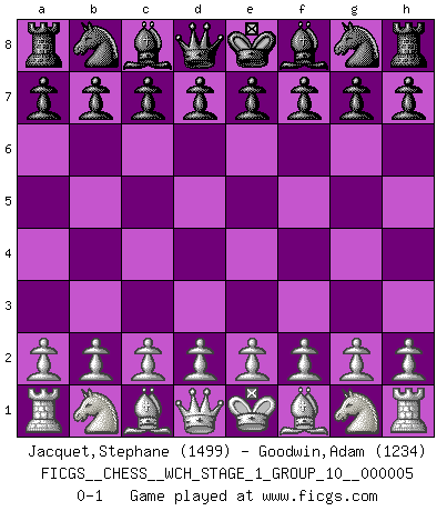 Last move : 0-1 2008 August 7 17:16:17 [Event "FICGS__CHESS__WCH_STAGE_1_GROUP_10__000005"] [Site "FICGS"] [Date "2008.07.08"] [Round "1"] [White "Jacquet,Stephane"] [Black "Goodwin,Adam"] [Result "0-1"] [WhiteElo "1499"] [BlackElo "1234"] 0-1 This chess game has been lost on time (started : 2008.07.08 16:25:19) Player Black won this chess game. Follow this game move after move (download)Chess is ruthless: you've got to be prepared to kill people. (Nigel Short) Sitze auf Deine Hände. (Siegbert Tarrasch) Cada Peón es una Reina en potencia. (James Mason) Le succès, c'est être capable d'aller d'échec en échec sans perdre son enthousiasme. (Winston Churchill) The problem with manipulation is that people can turn on you. (Horatio Caine, C.S.I. Miami)