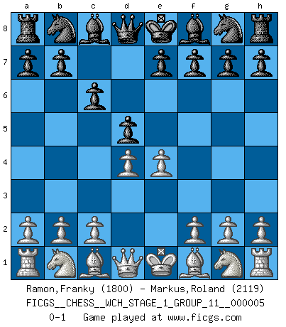 Last move : 0-1 2008 August 15 6:6:34 [Event "FICGS__CHESS__WCH_STAGE_1_GROUP_11__000005"] [Site "FICGS"] [Date "2008.07.08"] [Round "1"] [White "Ramon,Franky"] [Black "Markus,Roland"] [Result "0-1"] [WhiteElo "1800"] [BlackElo "2119"] 1.e4 c6 2.d4 d5 0-1 This chess game has been lost on time (started : 2008.07.08 16:26:54) Caro-Kann defense Player Black won this chess game. Follow this game move after move (download)Bobby is the most misunderstood, misquoted celebrity walking the face of this earth. (Yasser Seirawan) Lisa Lane, amerikanische Schachmeisterin, hatte Fischer einmal als stärksten lebenden Spieler bezeichnet. Antwort: Das ist richtig, aber Lisa Lane ist eigentlich nicht in der Lage, das zu beurteilen. (Robert James Fischer) De todos mis libros Rusos, la defensa contiene y difunde el 'calor' mas grande que pudiese verse extraño al observar lo supremamente abstracto que el Ajedrez supuestamente es. (Vladimir Nabokov) On est toujours la mazette de quelqu'un d'autre. (Anonyme) I've never seen so many men wasted so badly. (Blondie in The Good, The Bad and The Ugly)