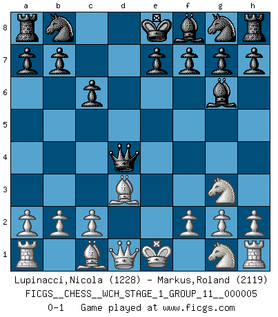 Last move : 0-1 2008 August 25 13:19:9 [Event "FICGS__CHESS__WCH_STAGE_1_GROUP_11__000005"] [Site "FICGS"] [Date "2008.07.29"] [Round "1"] [White "Lupinacci,Nicola"] [Black "Markus,Roland"] [Result "0-1"] [WhiteElo "1228"] [BlackElo "2119"] 1.e4 c6 2.d4 d5 3.Nc3 dxe4 4.Nxe4 Bf5 5.Ng3 Bg6 6.Bd3 Qxd4 0-1 Caro-Kann : Classical variation Player Black won this chess game. Follow this game move after move (download)In a gambit you give up a Pawn for the sake of getting a lost game. (Samuel Standige Boden) Ich trinke, ich rauche, ich spiele, ich liebe Frauen aber Fernschach ist ein Laster, das ich nicht habe. (Mikhail Nekhemyevich Tal) ¿Quién es tu oponente esta tarde? Esta tarde mi oponente son las piezas negras. (Akiba Rubinstein) Aux échecs, les retours au sommet sont rares : les dommages psychologiques consécutifs à une défaite sont trop sévères. (Daily Telegraph) The existence of forgetting has never been proved: We only know that some things don't come to mind when we want them. (Friedrich Nietzsche)