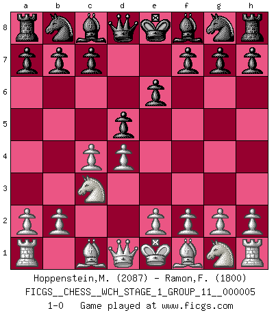 Last move : 1-0 2008 September 17 22:0:14 [Event "FICGS__CHESS__WCH_STAGE_1_GROUP_11__000005"] [Site "FICGS"] [Date "2008.07.08"] [Round "1"] [White "Hoppenstein,Michael"] [Black "Ramon,Franky"] [Result "1-0"] [WhiteElo "2087"] [BlackElo "1800"] 1.d4 e6 2.c4 d5 3.Nc3 1-0 This chess game has been lost on time (started : 2008.07.08 16:26:54) Queen's pawn Player White won this chess game. Follow this game move after move (download)If cunning alone were needed to excel, women would be the best Chess players. (Albin) Ich kämpfe solange mein Gegner einen Fehler machen kann. (Emanuel Lasker) El Ajedrez es realmente noventa y nueve por ciento calculación. (Soltis) Le pion, dans sa simplicité, marche droit devant lui, mais lorsqu'il prend, il le fait obliquement? Ainsi l'homme, tant qu'il reste pauvre, marche dans la droiture et vit honnêtement, mais lorsqu'il recherche les honneurs, il flatte, se parjure et, par les voies obliques, cherche une position supérieure sur l'échiquier du monde. (Jean de Galles) All art requires courage. (Anne Tucker)