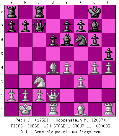 Last move : 0-1 2008 October 12 23:21:23 [Event "FICGS__CHESS__WCH_STAGE_1_GROUP_11__000005"] [Site "FICGS"] [Date "2008.07.08"] [Round "1"] [White "Pech,Jaroslav"] [Black "Hoppenstein,Michael"] [Result "0-1"] [WhiteElo "1752"] [BlackElo "2087"] 1.e4 c5 2.Nf3 d6 3.d4 Nf6 4.Nc3 cxd4 5.Nxd4 g6 6.Be3 Bg7 7.f3 O-O 8.Qd2 Nc6 9.O-O-O Nxd4 10.Bxd4 Be6 11.Kb1 Qc7 12.g4 Rfc8 13.h4 h5 0-1 This chess game has been lost on time (started : 2008.07.08 16:26:54) Sicilian Kingside Castling by player Black (move 7) Queenside Castling by player White (move 9) Player Black won this chess game. Follow this game move after move (download)During a Chess competition a Chessmaster should be a combination of a beast of prey and a monk. (Alexander Alekhine) Ich habe kein Problem mit Frauen, sondern nur mit dem Niveau ihres Schachspiels (Judith Polgar) El juego de Fischer siempre fue nítido, racional y brillante. Uno de los mejores por siempre. (Dave Regis) Les Echecs représentent une sphère d'idées créatrices basée sur la volonté des deux protagonistes. (Smyslov) Luck never gives; it only lends. (Swedish proverb)