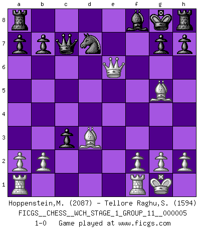 Last move : 1-0 2008 September 19 11:8:51 [Event "FICGS__CHESS__WCH_STAGE_1_GROUP_11__000005"] [Site "FICGS"] [Date "2008.07.08"] [Round "1"] [White "Hoppenstein,Michael"] [Black "Tellore Raghu,Shyam Sundar"] [Result "1-0"] [WhiteElo "2087"] [BlackElo "1594"] 1.d4 d5 2.c4 c6 3.Nf3 Bg4 4.Ne5 Nf6 5.Nxg4 Nxg4 6.e4 Nf6 7.e5 Nfd7 8.Nc3 e6 9.Bd3 Be7 10.Qg4 Bf8 11.Bg5 Qc7 12.O-O c5 13.cxd5 cxd4 14.dxe6 dxc3 15.exf7+ Kxf7 16.e6+ Kg8 17.exd7 Nxd7 18.Qe6+ 1-0 QGD Slav : 3.Nf3 Kingside Castling by player White (move 12) Player White won this chess game. Follow this game move after move (download)The way he plays Chess demonstrates a man's whole nature. (Stanley Ellin) Ich las kürzlich ein Buch von Nietzsche. Er sagte Religion verdumme nur die Menschen. Ich stimme zu. (Robert James Fischer) El juego de Damas es para vagabundos. (Paul Morphy) Les Echecs ont trois composantes : le temps, l'espace et le matériel en dernier. (Mikhail Tal) I feel so... helpless. (C-3PO in Star Wars ep.3)