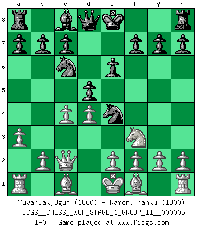 Last move : 1-0 2008 August 17 18:15:57 [Event "FICGS__CHESS__WCH_STAGE_1_GROUP_11__000005"] [Site "FICGS"] [Date "2008.07.08"] [Round "1"] [White "Yuvarlak,Ugur"] [Black "Ramon,Franky"] [Result "1-0"] [WhiteElo "1860"] [BlackElo "1800"] 1.d4 e6 2.c4 d5 3.Nc3 Bb4 4.Nf3 Nf6 5.Qb3 Nc6 6.a3 Bxc3+ 7.Qxc3 Ne4 8.Qc2 1-0 This chess game has been lost on time (started : 2008.07.08 16:26:54) Queen's pawn Player White won this chess game. Follow this game move after move (download)Some sacrifices are sound; the rest are mine. (Mikhail Tal) Woher wissen wir, daß der Neanderthaler Blindschach gespielt hat? -- Bei Ausgrabungen wurden keine Schachbretter und Figuren gefunden. (Anonymous) Aquellos que dicen entender al Ajedrez, no entienden nada. (Robert Hubner) Si je n'étais pas joueur d'échecs, je serais le meilleur dans quelque chose d'autre. (Anatoli Karpov) A journey of a thousand sites begins with a single click. (Author unknown)