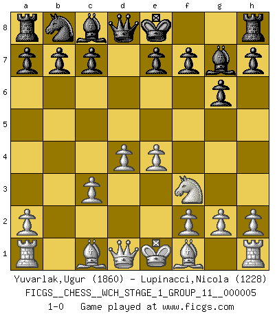 Last move : 1-0 2008 October 2 10:38:30 [Event "FICGS__CHESS__WCH_STAGE_1_GROUP_11__000005"] [Site "FICGS"] [Date "2008.07.29"] [Round "1"] [White "Yuvarlak,Ugur"] [Black "Lupinacci,Nicola"] [Result "1-0"] [WhiteElo "1860"] [BlackElo "1228"] 1.d4 Nf6 2.c4 g6 3.Nc3 d5 4.cxd5 Nxd5 5.e4 Nxc3 6.bxc3 Bg7 7.Nf3 1-0 This chess game has been lost on time (started : 2008.07.29 23:33:9) King's Indian defense, 3.Nc3 Player White won this chess game. Follow this game move after move (download)One doesn't have to play well, it's enough to play better than your opponent. (Siegbert Tarrasch) Mein erstes Ziel war nicht, die Partie zu gewinnen, sondern eine Figur zu opfern. -- der junge (Wilhelm Steinitz) Hasta este punto, las blancas han seguido un análisis bien conocido. Pero ahora el hace un error fatal: empieza a usar su propia cabeza. (Siegbert Tarrasch) Le thème de l'attaque double intervient d'une manière ou d'une autre dans l'immense majorité des combinaisons. (Youri Averbakh) The mind is like a parachute, it only functions when its open. (Unknown)