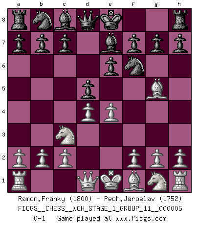 Last move : 0-1 2008 August 16 6:9:1 [Event "FICGS__CHESS__WCH_STAGE_1_GROUP_11__000005"] [Site "FICGS"] [Date "2008.07.08"] [Round "1"] [White "Ramon,Franky"] [Black "Pech,Jaroslav"] [Result "0-1"] [WhiteElo "1800"] [BlackElo "1752"] 1.e4 e6 2.d4 d5 3.Nc3 Nf6 4.Bg5 Be7 0-1 This chess game has been lost on time (started : 2008.07.08 16:26:54) French : Classical Player Black won this chess game. Follow this game move after move (download)In blitz, the Knight is stronger than the Bishop. (Vlastimil Hort) Ich war schon mal beim Dopingtest. Da musste ich Urin abgeben, während Dritte zusahen. (Elisabeth Pähtz) El Ajedrez es una guerra en un tablero. El objetivo es aplastar la mente del oponente. (Bobby Fischer) Il s'avisa de me proposer d'apprendre les échecs qu'il jouait un peu... me voilà forcené des échecs. J'achète un échiquier, je m'enferme dans ma chambre, j'y passe des jours et des nuits à vouloir apprendre par cur toutes les parties. (Jean-Jacques Rousseau, Confessions) Watch your thoughts; they become words. Watch your words; they become actions. Watch your actions; they become habits. Watch your habits; they become character. Watch your character; it becomes your destiny. (Frank Outlaw)
