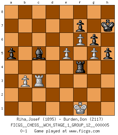 Last move : 0-1 2008 August 21 13:4:9 [Event "FICGS__CHESS__WCH_STAGE_1_GROUP_12__000005"] [Site "FICGS"] [Date "2008.07.08"] [Round "1"] [White "Riha,Josef"] [Black "Burden,Don"] [Result "0-1"] [WhiteElo "1895"] [BlackElo "2117"] 1.e4 c5 2.Nc3 Nc6 3.g3 g6 4.Bg2 Bg7 5.d3 d6 6.Be3 Nf6 7.h3 O-O 8.Nge2 Bd7 9.O-O b5 10.a3 Qc8 11.g4 h5 12.f3 Qb7 13.g5 Nh7 14.f4 a5 15.e5 dxe5 16.h4 Bg4 17.Bxc5 b4 18.Nd5 Qb5 19.Bxe7 Rfe8 20.axb4 e4 21.c4 Qb8 22.dxe4 Nxe7 23.Nxe7+ Rxe7 24.e5 R8a7 25.b5 Red7 26.Bd5 Nf8 27.Qe1 Ne6 28.Nc3 Nc5 29.Qe3 Bf8 30.Kh1 Kg7 31.Ra2 Ne6 32.b6 Rab7 33.Na4 Qc8 34.Kg1 Rb8 35.Rf2 Bb4 36.Kg2 Re7 37.b3 Nc5 38.Rfb2 Qd8 39.b7 Nxa4 40.Rxa4 R8xb7 41.Ra1 Rbd7 42.Qd4 Be6 43.Rd1 Qc7 44.Qg1 Bc5 45.Qe1 Qd8 46.Qd2 Qb6 47.Qc3 Bb4 48.Qd3 Re8 49.Rf2 Red8 50.Qe4 Bc5 51.Rf3 Qb4 52.Qe1 Qxe1 53.Rxe1 Rxd5 54.cxd5 Bxd5 55.Ref1 Bxf3+ 56.Rxf3 Rd2+ 57.Kf1 Rh2 58.f5 Rxh4 59.f6+ Kh7 60.Rc3 Rf4+ 0-1 Sicilian : Closed, 6.Be3 Kingside Castling by player Black (move 7) Kingside Castling by player White (move 9) Player Black won this chess game. Follow this game move after move (download)A win by an unsound combination, however showy, fills me with artistic horror. (Wilhelm Steinitz) Es macht mich traurig, wenn ich sehe, dass Golfprofis mehr verdienen als Schachsportler. Obwohl ich davon überzeugt bin, dass wir Schachspieler viel härter trainieren müssen als die Golfer. (Alexandra Kosteniuk) El Ajedrez es un regaderazo frío para la mente. (Sir John Simon) En blitz, le Cavalier l'emporte sur le Fou. (Vlastimil Hort) Always remember that you are unique; just like everyone else. (Unknown)
