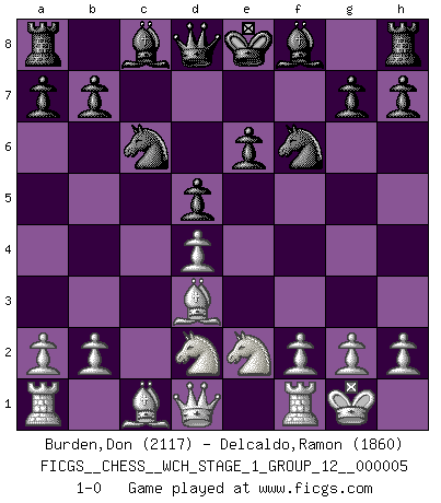 Last move : 1-0 2008 August 20 18:40:15 [Event "FICGS__CHESS__WCH_STAGE_1_GROUP_12__000005"] [Site "FICGS"] [Date "2008.07.08"] [Round "1"] [White "Burden,Don"] [Black "Delcaldo,Ramon"] [Result "1-0"] [WhiteElo "2117"] [BlackElo "1860"] 1.e4 e6 2.d4 d5 3.Nd2 Nf6 4.e5 Nfd7 5.c3 c5 6.Bd3 Nc6 7.Ne2 cxd4 8.cxd4 f6 9.exf6 Nxf6 10.O-O 1-0 This chess game has been lost on time (started : 2008.07.08 16:28:5) French : Tarrasch, Closed variation Kingside Castling by player White (move 10) Player White won this chess game. Follow this game move after move (download)First-class players lose to second-class players because second-class players sometimes play a first-class game. (Siegbert Tarrasch) Nur ein wirklich starker Spieler weiß wie schwach er spielt. (Savielly Grigorievitsch Tartakower) Es el objetivo de la escuela moderna no tratar cada posición de acuerdo a una regla general, sino de acuerdo al principio inherente en la posición. (Richard Reti) Je ne suis pas le dernier à jouer lâchement des coups douteux pendant le zeïtnot de l'adversaire pour l'achever: en effet les coups qui font le plus peur sont ceux que l'on ne comprend pas. Je me fais souvent peur quand je joue. (Un professeur anonyme) As a goal marker shodan is important. As a destination it is a poor place to stop. (Thomas Tamayo)