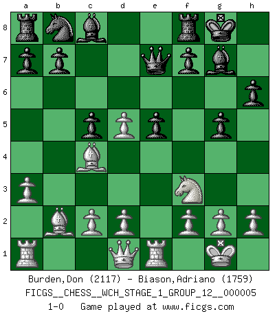 Last move : 1-0 2008 August 29 19:37:21 [Event "FICGS__CHESS__WCH_STAGE_1_GROUP_12__000005"] [Site "FICGS"] [Date "2008.07.08"] [Round "1"] [White "Burden,Don"] [Black "Biason,Adriano"] [Result "1-0"] [WhiteElo "2117"] [BlackElo "1759"] 1.e4 e5 2.Nf3 Qe7 3.Bc4 h6 4.O-O c5 5.Nc3 Nf6 6.a3 d6 7.b4 g5 8.bxc5 dxc5 9.Bb2 Bg7 10.Nd5 Nxd5 11.exd5 O-O 12.Re1 1-0 This chess game has been lost on time (started : 2008.07.08 16:28:5) Gunderam defense Kingside Castling by player White (move 4) Kingside Castling by player Black (move 11) Player White won this chess game. Follow this game move after move (download)Chess is played with the mind and not with the hands ! (Renaud and Kahn) Es gibt nur zwei wahre Schachgenies - das andere war Wilhelm Steinitz, der Weltmeister von 1872 bis 1894. (Robert James Fischer) Bobby Fischer es el jugador de Ajedrez mas grande que jamás haya existido. (Ken Smith) C'est une question de caractère, Beaucoup de gens perdent leur motivation très vite. D'autres, ils sont rares, peuvent la conserver très longtemps. J'aime les échecs, encore aujourd'hui je suis heureux d'analyser des parties. J'aime toujours gagner, je déteste encore perdre. Bien jouer est important pour mon intégrité intellectuelle et morale. Et puis les échecs vivent en ce moment une période historique grâce à Internet. Ils se développent dans les systèmes éducatifs à travers le monde. Ils sortent de leur ghetto, et c'est mon rôle de mener à bien cette révolution. (Gary Kasparov) When the going gets tactical, the computers get going. (Hyatt)