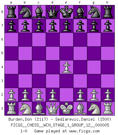 Last move : 1-0 2008 August 7 17:16:17 [Event "FICGS__CHESS__WCH_STAGE_1_GROUP_12__000005"] [Site "FICGS"] [Date "2008.07.08"] [Round "1"] [White "Burden,Don"] [Black "Sedlarevic,Daniel"] [Result "1-0"] [WhiteElo "2117"] [BlackElo "1500"] 1.e4 1-0 This chess game has been lost on time (started : 2008.07.08 16:28:5) King's pawn Opening Player White won this chess game. Follow this game move after move (download)My opponents make good moves too. Sometimes I don't take these things into consideration. (Bobby Fischer) Der Bart als Geschlechtszeichen mitten im Gesicht ist obszön. Daher gefällt er den Weibern. [Zugegeben, kein Schachzitat, aber unglaublich originell] (Arthur Schopenhauer) Cuando tu no sabes absolutamente que mas hacer, es tiempo de entrar en pánico. (John van der Wiel) Tous ces prétendus hommes politiques sont les pions, les Cavaliers, les Tours ou les Fous d'une partie d'échecs qui se jouera tant qu'un hasard ne renversera pas l'échiquier. (Honoré de Balzac) It is not true that people stop pursuing dreams because they grow old, they grow old because they stop pursuing dreams. (Gabriel Garcia Marquez)
