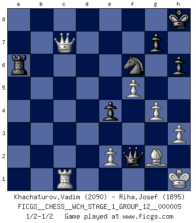 Last move : 1/2-1/2 2008 July 27 21:38:19 [Event "FICGS__CHESS__WCH_STAGE_1_GROUP_12__000005"] [Site "FICGS"] [Date "2008.07.08"] [Round "1"] [White "Khachaturov,Vadim"] [Black "Riha,Josef"] [Result "1/2-1/2"] [WhiteElo "2090"] [BlackElo "1895"] 1.d4 Nf6 2.c4 e6 3.Nf3 Bb4+ 4.Bd2 Qe7 5.g3 Nc6 6.Nc3 Bxc3 7.Bxc3 Ne4 8.Rc1 d6 9.d5 Nxc3 10.Rxc3 Nb8 11.Bg2 O-O 12.dxe6 fxe6 13.Nd4 e5 14.Nc2 Nd7 15.O-O a5 16.Qd2 Ra6 17.Ra3 b6 18.f4 Kh8 19.Re3 Nf6 20.h3 e4 21.Nd4 a4 22.g4 Bb7 23.f5 Ra5 24.Ne6 Rg8 25.Ra3 Bc6 26.b4 Re5 27.b5 Bd7 28.Nd4 d5 29.Rxa4 dxc4 30.Rxc4 Bxb5 31.Nxb5 Rxb5 32.Qc1 Rc5 33.Rxc5 bxc5 34.Qc4 Rd8 35.a4 h6 36.Rc1 Qe5 37.a5 Rd4 38.Qc3 c4 39.Qa3 Rd5 40.a6 Ra5 41.Qc3 Qc5+ 42.Kh1 Rxa6 43.Qxc4 Qe3 44.Qc3 Qf2 45.Qxc7 1/2-1/2 Bogo-Indian defense, Nimzovich variation Kingside Castling by player Black (move 11) Kingside Castling by player White (move 15) This chess game ended in a draw. Follow this game move after move (download)Strategy requires thought, tactics require observation. (Max Euwe) Über die Verhaftung Bobby Fischers: Warum es die Bush-Administration für nötig befindet einen 61 Jahre alten Mann zu hetzten, der für niemanden ausser sich selbste eine Gefahr darstellt ist ein Rätsel. (Nigel Short) En la vida, como en el Ajedrez, los Peones propios obstruyen nuestro camino. La gran fortuna de un hombre, su comodidad, placer, hijos, libros, que deberían ayudarle a ganar, con mucha frecuencia lo ponen en Jaque Mate. (Charles Buxton) Les pièces de l'échiquier étaient impitoyables. Elles le retenaient, elles l'absorbaient. Il y avait de l'horreur en cela, mais aussi une harmonie unique. Car, qu'y a-t-il dans le monde, à part les échecs ? (V. Nabokov) Do you know these so called Volunteers don't even get paid! (Simpsons)
