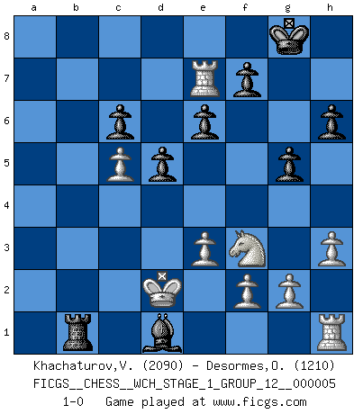 Last move : 1-0 2008 August 14 22:14:22 [Event "FICGS__CHESS__WCH_STAGE_1_GROUP_12__000005"] [Site "FICGS"] [Date "2008.07.08"] [Round "1"] [White "Khachaturov,Vadim"] [Black "Desormes,Olivier"] [Result "1-0"] [WhiteElo "2090"] [BlackElo "1210"] 1.d4 d5 2.c4 Bf5 3.Nc3 e6 4.Nf3 c6 5.Qb3 Qb6 6.c5 Qxb3 7.axb3 Nd7 8.b4 Be7 9.Bf4 Ngf6 10.h3 h6 11.e3 O-O 12.b5 Ne4 13.bxc6 bxc6 14.Ba6 g5 15.Bh2 Rfb8 16.Bxb8 Rxb8 17.Nxe4 Bxe4 18.Be2 Rxb2 19.Rxa7 Rb1+ 20.Bd1 Nxc5 21.Rxe7 Bc2 22.Kd2 Bxd1 23.dxc5 1-0 QGD : Grau (Sahovic) defense Kingside Castling by player Black (move 11) Player White won this chess game. Follow this game move after move (download)A good player is always lucky. (Jose Raul Capablanca) Ein Schachgenie ist jemand der verdammt gut Schach spielt. (Jonathan Levitt) Todo lo que importa ante el tablero de Ajedrez son buenas jugadas. (Bobby Fischer) Il n'y a pas de prix trop élevé au scalp de l'ennemi. (Koblentz) You know what they say : You lie down with the Devil, you wake up in Hell. (Horatio Caine, C.S.I. Miami)