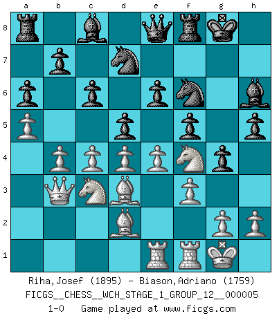Last move : 1-0 2008 August 24 7:8:56 [Event "FICGS__CHESS__WCH_STAGE_1_GROUP_12__000005"] [Site "FICGS"] [Date "2008.07.08"] [Round "1"] [White "Riha,Josef"] [Black "Biason,Adriano"] [Result "1-0"] [WhiteElo "1895"] [BlackElo "1759"] 1.d4 d5 2.c4 e6 3.Nc3 c6 4.e3 f5 5.Bd3 Nf6 6.Nge2 g6 7.O-O Bg7 8.b4 O-O 9.Qb3 a6 10.a4 g5 11.a5 h5 12.f3 g4 13.Nf4 Qe8 14.Bd2 Bh6 15.Rae1 Nbd7 16.e4 1-0 This chess game has been lost on time (started : 2008.07.08 16:28:5) QGD : Semi-Slav Kingside Castling by player White (move 7) Kingside Castling by player Black (move 8) Player White won this chess game. Follow this game move after move (download)When you absolutely don't know what to do anymore, it is time to panic. (John van der Wiel) Es gibt zwei Arten von Opfern: Korrekte und meine. (Mikhail Nekhemyevich Tal) Es el objetivo de la escuela moderna no tratar cada posición de acuerdo a una regla general, sino de acuerdo al principio inherente en la posición. (Richard Reti) Il (Jacob Murray) ne joue pas pour le bon coup, mais pour le meilleur. (Eloi Relange) A belief is an idea the mind possesses, an idea that possesses the mind. (Robert Oxden Bolton)