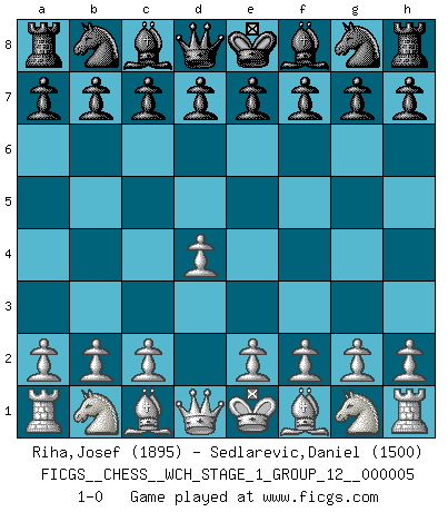 Last move : 1-0 2008 August 7 17:16:17 [Event "FICGS__CHESS__WCH_STAGE_1_GROUP_12__000005"] [Site "FICGS"] [Date "2008.07.08"] [Round "1"] [White "Riha,Josef"] [Black "Sedlarevic,Daniel"] [Result "1-0"] [WhiteElo "1895"] [BlackElo "1500"] 1.d4 1-0 This chess game has been lost on time (started : 2008.07.08 16:28:5) Queen's pawn Player White won this chess game. Follow this game move after move (download)Chess, like love, is infectious at any age. (Flohr) Den Ruhm habe ich schon, jetzt brauche ich noch das Geld. (Wilhelm Steinitz) El ganar no lo es todo... pero el perder es nada. (Mednis) Je menace de comprendre la position. (Anonyme) Secret operations are essential in war; upon them the army relies to make its every move. (Sun Tzu)