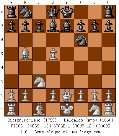 Last move : 1-0 2008 August 18 6:22:13 [Event "FICGS__CHESS__WCH_STAGE_1_GROUP_12__000005"] [Site "FICGS"] [Date "2008.07.08"] [Round "1"] [White "Biason,Adriano"] [Black "Delcaldo,Ramon"] [Result "1-0"] [WhiteElo "1759"] [BlackElo "1860"] 1.e4 e6 2.c4 d5 3.exd5 exd5 4.cxd5 Nf6 5.Bb5+ Bd7 6.Qe2+ Be7 7.Nc3 1-0 This chess game has been lost on time (started : 2008.07.08 16:28:5) French defense, Steiner variation Player White won this chess game. Follow this game move after move (download)I give 98 percent of my mental energy to Chess. Others give only 2 percent. (Bobby Fischer) Was ist der Unterschied zwischen einem Strassenarbeiter und einem Schachspieler? --Der Schachspieler bewegt sich ab und zu. (Anonymous) Dios mío, Bobby Fischer juega tan simple. (Alexei Suetin) Plusieurs personnes se sont demandées comment Tal faisait pour gagner... En fait, c'est très simple ! Il met ses pièces au centre de l'échiquier et les sacrifie quelque part ! (David Bronstein) The leaves of memory seemed to make a mournful rustling in the dark. (Henry Wadsworth Longfellow)