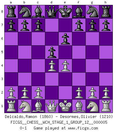 Last move : 0-1 2008 August 18 6:22:13 [Event "FICGS__CHESS__WCH_STAGE_1_GROUP_12__000005"] [Site "FICGS"] [Date "2008.07.08"] [Round "1"] [White "Delcaldo,Ramon"] [Black "Desormes,Olivier"] [Result "0-1"] [WhiteElo "1860"] [BlackElo "1210"] 1.e4 e6 2.d4 d5 0-1 This chess game has been lost on time (started : 2008.07.08 16:28:5) French defense Player Black won this chess game. Follow this game move after move (download)I prefer to lose a really good game than to win a bad one. (David Levy) Alle Schachspieler sollten auch ein Hobby haben. (Savielly Grigorievitsch Tartakower) El hombre es un frívolo, una creatura engañosa y como un jugador de Ajedrez, se preocupa mas por el proceso de obtener su meta que de la meta por sí misma. (Dostoyevsky) Mon pion favori sur ma case favorite ! Bronstein en parlant d'un coup de pion en h5 quand il avait les Noirs. God, you are such an idiot. - Actually, I thought I was more of a jerk. (Gregory House to Stacy Warner, House M.D.)