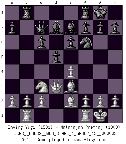 Last move : 0-1 2008 September 19 22:7:54 [Event "FICGS__CHESS__WCH_STAGE_1_GROUP_12__000005"] [Site "FICGS"] [Date "2008.07.08"] [Round "1"] [White "Inving,Yugi"] [Black "Natarajan,Premraj"] [Result "0-1"] [WhiteElo "1591"] [BlackElo "1800"] 1.e4 c5 2.Nf3 Nc6 3.d4 cxd4 4.Nxd4 Nf6 5.Nc3 d6 6.Bb5 Bd7 7.Bg5 e6 8.Nxc6 bxc6 9.Be2 Rb8 10.Rb1 Qc7 11.O-O Be7 12.Qd3 d5 13.Be3 O-O 0-1 This chess game has been lost on time (started : 2008.07.08 16:28:5) Sicilian defense Kingside Castling by player White (move 11) Kingside Castling by player Black (move 13) Player Black won this chess game. Follow this game move after move (download)Bobby is the most misunderstood, misquoted celebrity walking the face of this earth. (Yasser Seirawan) Fischer: 'Remis!?' Uhlmann: 'Aber es muss doch dreimal Zugwiederholung sein!' Fischer: 'Sie nehmen das Remis an, wie ich es sage, sonst spiele ich weiter und werde Sie dann schlagen!' (Robert James Fischer) Uno por uno, yo los acribillé, mi superioridad muy pronto se volvio aparente. (Jose Capablanca) Avant la finale, les dieux ont créé le milieu de partie. (Tarrasch) Luck is when opportunity knocks and you answer. (Anonymous)