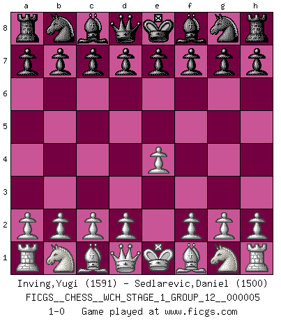 Last move : 1-0 2008 August 8 5:18:8 [Event "FICGS__CHESS__WCH_STAGE_1_GROUP_12__000005"] [Site "FICGS"] [Date "2008.07.08"] [Round "1"] [White "Inving,Yugi"] [Black "Sedlarevic,Daniel"] [Result "1-0"] [WhiteElo "1591"] [BlackElo "1500"] 1.e4 1-0 This chess game has been lost on time (started : 2008.07.08 16:28:5) King's pawn Opening Player White won this chess game. Follow this game move after move (download)A great player and a great example for many. His book My 60 Memorable Games had a big impact on me. It is a shame he didn't continue to enrich the world of chess with his unparalleled understanding after 1972. (Jan Timman, about Bobby Fischer's death) Ich organisiere ein großes Turnier, was mich etwa 120000 Dollar kostet. Ich denke, das ist das erste Mal in der Schachgeschichte, daß ein Schachgroßmeister auch als Mäzen auftritt. (Miguel Najdorf) EL Ajedrez es como la vida. (Boris Spassky) Les échecs, c'est la lutte contre l'erreur. (Johannes Zukertort) Life is like a game of cards: the hand you are dealt represents determinism; the way you play it is free will. (Jawaharlal Nehru)