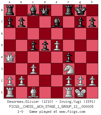 Last move : 1-0 2008 September 13 9:42:13 [Event "FICGS__CHESS__WCH_STAGE_1_GROUP_12__000005"] [Site "FICGS"] [Date "2008.07.08"] [Round "1"] [White "Desormes,Olivier"] [Black "Inving,Yugi"] [Result "1-0"] [WhiteElo "1210"] [BlackElo "1591"] 1.d4 e6 2.Nf3 f6 3.e4 Ne7 4.Bd3 Nbc6 5.c3 d5 6.e5 fxe5 7.Nxe5 Nxe5 8.dxe5 Nf5 9.Bxf5 exf5 10.O-O Be7 11.Nd2 O-O 12.Nf3 f4 13.Qd4 c5 14.Qa4 1-0 This chess game has been lost on time (started : 2008.07.08 16:28:5) Queen's pawn Kingside Castling by player White (move 10) Kingside Castling by player Black (move 11) Player White won this chess game. Follow this game move after move (download)On the chessboard, lies and hypocrisy do not survive long. (Emanuel Lasker) Ich verstehe Aljechins Kombinationen ganz gut; aber woher er diese Angriffschancen bekommt und wie er die Eröffnung behandelt das ist für mich ein Buch mit sieben Siegeln. (Rudolf Spielmann) Observen a Garry Kasparov. Después de una derrota, invariablemente el gana la próxima partida. Prácticamente hace pedazos a su siguiente oponente. Eso es algo que tenemos que aprender a lograr. (Maurice Ashley) Toute estimation doit être constamment réévaluée. (Jacob Estrin) Wisdom is the reward you get for a lifetime of listening when you'd have preferred to talk. (Doug Larson)