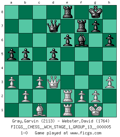 Last move : 1-0 2008 October 14 23:28:43 [Event "FICGS__CHESS__WCH_STAGE_1_GROUP_13__000005"] [Site "FICGS"] [Date "2008.07.08"] [Round "1"] [White "Gray,Garvin"] [Black "Webster,David"] [Result "1-0"] [WhiteElo "2113"] [BlackElo "1764"] 1.e4 e5 2.Nf3 Nf6 3.Nxe5 d6 4.Nf3 Nxe4 5.Nc3 Nxc3 6.dxc3 Be7 7.Bc4 O-O 8.O-O Nc6 9.Re1 Bf5 10.Bf4 Qd7 11.Qd2 Bf6 12.Re2 Be6 13.Bxe6 fxe6 14.Rae1 Rae8 15.h3 Rf7 16.Qd3 a6 17.a3 b5 18.c4 h6 19.Bc1 Ne5 20.Nxe5 Bxe5 21.c5 a5 22.cxd6 cxd6 23.Re4 Bf6 24.c3 d5 25.R4e2 1-0 This chess game has been lost on time (started : 2008.07.08 16:30:54) Petrov : Nimzovich attack Kingside Castling by player Black (move 7) Kingside Castling by player White (move 8) Player White won this chess game. Follow this game move after move (download)All I want to do, ever, is just play Chess. (Bobby Fischer) Capablanka war das größte Genie der Schachgeschichte! Aber denken sie nicht er habe nichts vom Schach verstanden. Er wusste nur soviel wie er wissen musste um seine Ziele zu erreichen. (Mikhail Moiseyevich Botvinik) Solo el jugador con la iniciativa tiene el derecho a atacar. (Wilhelm Steinitz) J'ai vu le vaincu d'Echecs jouer des années durant dans l'espoir de la fête de la victoire. Car tu es plus riche de ce qu'elle existe si même elle n'est point pour toi. Ainsi de la perle du fond des mers. (Antoine de Saint-Exupéry) The absolute truth is the thing that makes people laugh. (Carl Reiner)