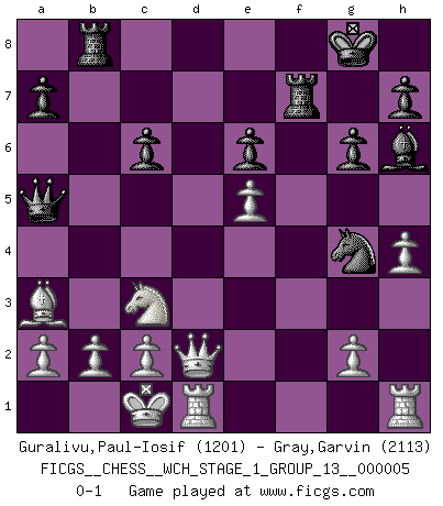 Last move : 0-1 2008 August 24 7:5:1 [Event "FICGS__CHESS__WCH_STAGE_1_GROUP_13__000005"] [Site "FICGS"] [Date "2008.07.08"] [Round "1"] [White "Guralivu,Paul-Iosif"] [Black "Gray,Garvin"] [Result "0-1"] [WhiteElo "1201"] [BlackElo "2113"] 1.e4 c5 2.Nf3 d6 3.d4 cxd4 4.Nxd4 Nf6 5.Nc3 g6 6.Bc4 Bg7 7.Bg5 O-O 8.Qd2 Nc6 9.Nxc6 bxc6 10.O-O-O Qa5 11.h4 Be6 12.Bxe6 fxe6 13.f4 Rab8 14.e5 dxe5 15.fxe5 Ng4 16.Bxe7 Rf7 17.Ba3 Bh6 0-1 Sicilian : Dragon variation Kingside Castling by player Black (move 7) Queenside Castling by player White (move 10) Player Black won this chess game. Follow this game move after move (download)Of Chess it has been said that life is not long enough for it, but that is the fault of life, not Chess. (William Ewart Napier) Schach ist ein Reich, wo sich die menschliche Phantasie frei entfalten kann. (David Bronstein) Fischer es una tragedia del Ajedrez Americano a la par con Morphy y Pillsbury. (Mig Greengard) Les échecs sont un jeu terrible. Si vous n'avez pas le centre, votre adversaire a une position plus libre. Par contre, si vous avez le centre, alors vous avez vraiment quelque chose pour laquelle vous inquiéter ! (Siegbert Tarrasch) . 'gn is not allowed in chess unless n is an integer between 1 and 8 inclusive, where 1 and 8 are to interpreted as the standard numerals standing for integers in the ordered real-closed field R, with the *canonical* ordering. (As opposed to, say, an integer in the domain Z[2+i*sqrt(5)] or an integer in some exotic Grothendieck topos). (Normajean Yates)