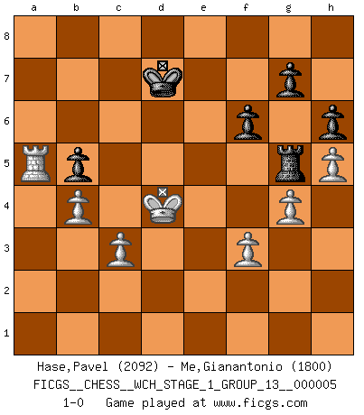 Last move : 1-0 2008 December 4 17:56:58 [Event "FICGS__CHESS__WCH_STAGE_1_GROUP_13__000005"] [Site "FICGS"] [Date "2008.07.29"] [Round "1"] [White "Hase,Pavel"] [Black "Me,Gianantonio"] [Result "1-0"] [WhiteElo "2092"] [BlackElo "1800"] 1.e4 c5 2.Nf3 d6 3.d4 cxd4 4.Nxd4 Nf6 5.Nc3 e6 6.g4 h6 7.h4 Nc6 8.Rg1 d5 9.Bb5 Bd7 10.exd5 Nxd5 11.Nxd5 exd5 12.Be3 Be7 13.Qd2 Nxd4 14.Bxd7+ Qxd7 15.Qxd4 Bf6 16.Qb4 Qe7 17.Qxe7+ Bxe7 18.O-O-O O-O-O 19.h5 b6 20.Rd3 Kb7 21.Re1 Rhe8 22.Bd2 Bc5 23.Rxe8 Rxe8 24.Rxd5 Kc6 25.Rf5 f6 26.c3 Re4 27.f3 Re2 28.Kd1 Rf2 29.a3 a6 30.a4 Bd6 31.Kc2 Rf1 32.Kd3 Ra1 33.b3 Ra3 34.Kc4 Bc5 35.Bc1 b5+ 36.axb5+ axb5+ 37.Kd3 Ra8 38.Rf4 Rd8+ 39.Ke2 Ra8 40.Re4 Ra2+ 41.Bd2 Bd6 42.Kd3 Ra3 43.Bc1 Ra1 44.Bf4 Bxf4 45.Rxf4 Rb1 46.b4 Re1 47.Re4 Rd1+ 48.Ke3 Rd5 49.Re6+ Kd7 50.Ra6 Re5+ 51.Kd4 Rg5 52.Ra5 1-0 Sicilian : Scheveningen, Keres attack Queenside Castling by player White (move 18) Queenside Castling by player Black (move 18) Player White won this chess game. Follow this game move after move (download)The mistakes are there, waiting to be made. (Savielly Tartakower) Wir irren allesamt, nur jeder irrt anders. (Georg Christoph Lichtenberg) Un mal día en el Ajedrez, es mejor que cualquier buen día en el trabajo. (Anonymous) L'attaque fait le spectacle, la défense gagne les matchs. (Dicton footballistique) Waiting for chance ? Play in casinos. (FICGS proverb)