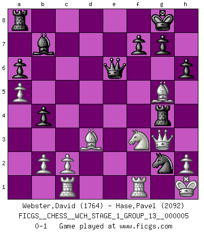Last move : 0-1 2008 September 22 13:12:20 [Event "FICGS__CHESS__WCH_STAGE_1_GROUP_13__000005"] [Site "FICGS"] [Date "2008.07.08"] [Round "1"] [White "Webster,David"] [Black "Hase,Pavel"] [Result "0-1"] [WhiteElo "1764"] [BlackElo "2092"] 1.e4 c5 2.Nf3 d6 3.d4 cxd4 4.Nxd4 Nf6 5.Nc3 a6 6.Be2 e5 7.Nb3 Be7 8.O-O O-O 9.Kh1 b5 10.a4 b4 11.Nd5 Bb7 12.Nxf6+ Bxf6 13.f3 Qc7 14.Be3 d5 15.exd5 Rd8 16.a5 Rxd5 17.Qe1 Be7 18.Rc1 Nc6 19.Bb6 Qc8 20.Bd3 Nd8 21.f4 Ne6 22.fxe5 Bg5 23.Nd2 Nf4 24.Qg3 h6 25.Be3 Nxg2 26.Bxg5 Rd4 27.e6 Qxe6 28.Nf3 Rg4 0-1 Sicilian : Najdorf, Opovcensky variation Kingside Castling by player White (move 8) Kingside Castling by player Black (move 8) Player Black won this chess game. Follow this game move after move (download)Let the perfectionist play postal. (Yasser Seirawan) Der Vorposten provoziert a) eine Basis für neue Angriffe und b) eine Schwächung der gegnerischen Widerstandskraft in der fraglichen Linie. (Aaron Nimzowitsch) Todos los jugadores de Ajedrez deberían tener un pasatiempo. (Savielly Tartakower) Avant la finale, les dieux ont créé le milieu de partie. (Tarrasch) Crush them ! Make them suffer ! (General Grievous in Star Wars ep.3)