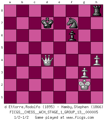 Last move : 1/2-1/2 2008 November 26 9:24:39 [Event "FICGS__CHESS__WCH_STAGE_1_GROUP_13__000005"] [Site "FICGS"] [Date "2008.07.08"] [Round "1"] [White "d Ettorre,Rodolfo"] [Black "Hamby,Stephen"] [Result "1/2-1/2"] [WhiteElo "1895"] [BlackElo "1866"] 1.Nf3 d5 2.c4 d4 3.b4 f6 4.e3 e5 5.c5 a5 6.Bb5+ c6 7.Bc4 Nh6 8.O-O Bg4 9.exd4 Bxf3 10.Qxf3 Qxd4 11.Qb3 axb4 12.Bb2 Qxc5 13.d4 exd4 14.a3 Qb6 15.Nd2 Kd8 16.h3 Nf5 17.Bd3 Nd6 18.axb4 Rxa1 19.Rxa1 Nd7 20.Nf3 c5 21.Ra4 Nc8 22.Qa2 cxb4 23.Nxd4 Bc5 24.Ne6+ Ke7 25.Nxg7 b3 26.Nf5+ Kd8 27.Qb1 Bxf2+ 28.Kh1 Qe6 29.Bc3 Ncb6 30.Ba5 Kc7 31.Nd4 Qe3 32.Nxb3 Rg8 33.Bd2 Qe6 34.Nd4 Qe7 35.Be4 Bxd4 36.Rxd4 Qe5 37.Bc3 Qc5 38.Rd3 Ne5 39.Bd4 Nxd3 40.Bxc5 Nxc5 41.Bxb7 Rg7 42.Bf3 Nbd7 43.Qf5 Kd6 44.Qf4+ Ke7 45.Qh6 Ne6 46.Bg4 Ndf8 47.Bf5 Rg5 48.Bxh7 Nxh7 49.Qxh7+ Rg7 50.Qe4 Rg8 51.Qb7+ Kd6 52.Qb4+ Kd7 53.h4 Rh8 54.g3 Ng5 55.Kg2 Nf7 56.Qd4+ 1/2-1/2 Reti : Advance variation Kingside Castling by player White (move 8) 10 pieces endgame at move 48 : White KQBPP , Black KRNNP WHITE : King + 1 Queen 1 Bishop 2 Pawns BLACK : King + 1 Rook 2 Knights 1 Pawn 9 pieces endgame at move 48 : White KQPP , Black KRNNP WHITE : King + 1 Queen 2 Pawns BLACK : King + 1 Rook 2 Knights 1 Pawn 8 pieces endgame at move 49 : White KQPP , Black KRNP WHITE : King + 1 Queen 2 Pawns BLACK : King + 1 Rook 1 Knight 1 Pawn This chess game ended in a draw. Follow this game move after move (download)Any material change in a position must come about by mate, a capture, or a Pawn promotion. (Purdy) Ich würde die 30 stärksten Spieler der USA im Simultanspiel besiegen. (José Raúl Capablanca) Estaba muy claro de que el punto vulnerable del Gran Maestro Americano (Bobby Fischer) radicaba en las posiciones de doble filo, colgantes, irracionales, donde el siempre falló en encontrar un triunfo aún en una posición de clara victoria. (Efim Geller) Ce qui est bien, c'est d'avoir tout un tas de pièces en prise : l'adversaire ne peut en prendre qu'une à la fois. Cité par Thierry Audin. Computers make it easier to do a lot of things, but most of the things they make it easier to do don't need to be done. (Andy Rooney)