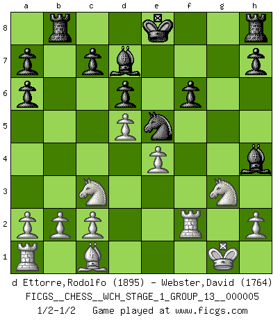 Last move : 1/2-1/2 2008 August 9 13:18:4 [Event "FICGS__CHESS__WCH_STAGE_1_GROUP_13__000005"] [Site "FICGS"] [Date "2008.07.08"] [Round "1"] [White "d Ettorre,Rodolfo"] [Black "Webster,David"] [Result "1/2-1/2"] [WhiteElo "1895"] [BlackElo "1764"] 1.e4 e5 2.f4 exf4 3.Nf3 d6 4.d4 g5 5.Bc4 g4 6.Ng1 Qh4+ 7.Kf1 Bh6 8.Nc3 Be6 9.d5 Bd7 10.Qd4 f6 11.Qf2 Qxf2+ 12.Kxf2 Ne7 13.Nge2 Ng6 14.Rf1 Bg5 15.Bd3 Na6 16.Bxa6 bxa6 17.Kg1 f3 18.gxf3 gxf3 19.Rxf3 Ne5 20.Rf2 Bh4 21.Ng3 Rb8 1/2-1/2 KGA : Fischer defense This chess game ended in a draw. Follow this game move after move (download)Chess, like any creative activity, can exist only through the combined efforts of those who have creative talent, and those who have the ability to organize their creative work. (Mikhail Botvinnik) Kein Schachspieler kann gut schlafen. (H. G. Wells) El Ajedrez es un invernadero donde los frutos del carácter pueden madurar mas completamente que en la vida. (Edward Morgan Foster) J'ai toujours senti une vague pitié pour l'homme qui ne connaît rien aux échecs, tout comme j'en aurais pour un homme ignorant de l'amour. Les Echecs, comme la musique ou comme l'amour, ont le pouvoir de rendre heureux. (Siegbert Tarrasch) Life is like a play: it's not the length but the excellence of the acting that matters. (Seneca)
