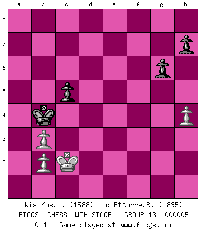 Last move : 0-1 2008 September 2 4:54:7 [Event "FICGS__CHESS__WCH_STAGE_1_GROUP_13__000005"] [Site "FICGS"] [Date "2008.07.08"] [Round "1"] [White "Kis-Kos,Laszlo"] [Black "d Ettorre,Rodolfo"] [Result "0-1"] [WhiteElo "1588"] [BlackElo "1895"] 1.e4 e5 2.Nf3 Nc6 3.Bb5 Nf6 4.O-O Nxe4 5.d4 a6 6.Ba4 b5 7.Bb3 d5 8.dxe5 Be6 9.c3 Bc5 10.Nbd2 O-O 11.Qe2 Bf5 12.Nxe4 dxe4 13.Ng5 Nxe5 14.Nxe4 Bg4 15.Qc2 Bb6 16.Bg5 Qd3 17.Rfe1 Qd7 18.Nc5 Nf3+ 19.gxf3 Bxc5 20.Rad1 Bd6 21.Re7 Qf5 22.Qxf5 Bxf5 23.Re3 Rae8 24.Rde1 Rxe3 25.fxe3 Be6 26.e4 Bxb3 27.axb3 f6 28.Bd2 Rd8 29.Be3 f5 30.exf5 Rf8 31.Ra1 Rxf5 32.f4 Bxf4 33.Bxf4 Rxf4 34.Rxa6 Rf6 35.Ra8+ Rf8 36.Rxf8+ Kxf8 37.Kf2 Ke7 38.c4 Ke6 39.Ke3 Ke5 40.cxb5 Kd5 41.h4 Kc5 42.Ke4 Kxb5 43.Kd4 c5+ 44.Kd3 Kb4 45.Kc2 g6 0-1 Ruy Lopez : Berlin defense, Rosenthal variation Kingside Castling by player White (move 4) Kingside Castling by player Black (move 10) 10 pieces endgame at move 36 : White KPPPP , Black KPPPP WHITE : King + 4 Pawns BLACK : King + 4 Pawns 9 pieces endgame at move 40 : White KPPPP , Black KPPP WHITE : King + 4 Pawns BLACK : King + 3 Pawns 8 pieces endgame at move 42 : White KPPP , Black KPPP WHITE : King + 3 Pawns BLACK : King + 3 Pawns Player Black won this chess game. Follow this game move after move (download)All I want to do, ever, is just play Chess. (Bobby Fischer) Viele Opfer benötigen überhaupt keine konkrete Berechnung. Es genügt sich die entstehende Position kurz vorzustellen, um uns davon zu überzeugen, dass das Opfer korrekt ist. (Mikhail Nekhemyevich Tal) Las Aperturas te enseñan aperturas. ¡Los Finales te enseñan Ajedrez!. (Stephan Gerzadowicz) Les échecs sont un jeu par leur forme, un art par leur essence et une science par sa difficulté d'acquisition. Ils peuvent vous procurer autant de plaisir qu'un bon livre ou une belle musique, mais vous n'aurez une réelle joie que si vous arrivez à bien jouer. (Tigran Petrosian) You think that education is too expensive ? Try ignorance. (Derek Bok)