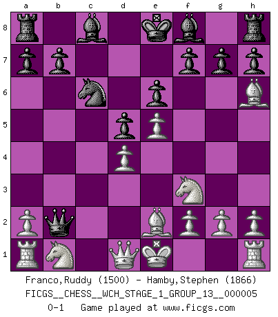 Last move : 0-1 2008 September 25 22:26:9 [Event "FICGS__CHESS__WCH_STAGE_1_GROUP_13__000005"] [Site "FICGS"] [Date "2008.07.29"] [Round "1"] [White "Franco,Ruddy"] [Black "Hamby,Stephen"] [Result "0-1"] [WhiteElo "1500"] [BlackElo "1866"] 1.e4 e6 2.e5 d5 3.d4 c5 4.c3 Nc6 5.Nf3 Qb6 6.Be2 cxd4 7.cxd4 Nh6 8.Bxh6 Qxb2 0-1 This chess game has been lost on time (started : 2008.07.29 23:28:49) French : Steinitz attack Player Black won this chess game. Follow this game move after move (download)A player surprised is half beaten. (Proverb) Ich bin stolz ein Bulgare zu sein. (Veselin Topalov) Botvinnik trataba de restarle el misterio al Ajedrez, siempre relacionandolo a situaciones de la vida ordinaria. El gustaba de llamar al Ajedrez un típico problema inexacto similar a aquellos de los cuales la gente siempre tiene que enfrentarse en la vida cotidiana. (Garry Kasparov) L'action d'une oeuvre littéraire se déroule sur un champ de bataille. Les masques et les types du drame moderne correspondent aux pièces du jeu d'échecs. L'intrigue correspond aux coups et aux gambits, c'est à dire aux techniques du jeu telles qu'utilisées et interprétées par les joueurs. Les tactiques et les péripéties [mouvements] correspondent aux coups exécutés par l'adversaire. (Viktor Shklovsky) Unless in communicating with it one says exactly what one means, trouble is bound to result. (Alan Turing, about computers)