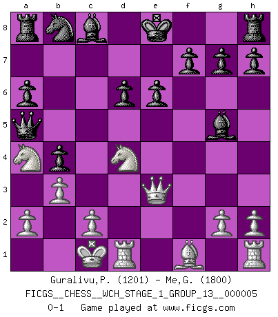 Last move : 0-1 2008 September 7 7:14:15 [Event "FICGS__CHESS__WCH_STAGE_1_GROUP_13__000005"] [Site "FICGS"] [Date "2008.07.29"] [Round "1"] [White "Guralivu,Paul-Iosif"] [Black "Me,Gianantonio"] [Result "0-1"] [WhiteElo "1201"] [BlackElo "1800"] 1.e4 c5 2.Nf3 d6 3.d4 cxd4 4.Nxd4 Nf6 5.Nc3 e6 6.Bg5 Be7 7.Qd2 a6 8.O-O-O b5 9.f4 b4 10.Na4 Qa5 11.b3 Nxe4 12.Qe3 Nxg5 13.fxg5 Bxg5 0-1 Sicilian : Scheveningen variation Queenside Castling by player White (move 8) Player Black won this chess game. Follow this game move after move (download)In the perfect Chess combination as in a first-rate short story, the whole plot and counter-plot should lead up to a striking finale, the interest not being allayed until the very last moment. (Yates and Winter) Wenn man heute mit 14 Jahren noch kein GM ist, kann man es vergessen. (Viswanathan Anand) No existe un remordimiento como el remordimiento del Ajedrez. (H. G. Wells) Nous vivons dans un monde échiquéen : chaque jour qui passe est un défi à relever. (Philosophe Sasha) You know what they say : You lie down with the Devil, you wake up in Hell. (Horatio Caine, C.S.I. Miami)