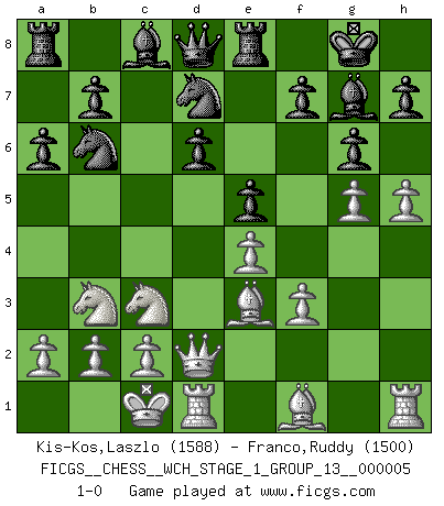 Last move : 1-0 2008 September 20 22:11:14 [Event "FICGS__CHESS__WCH_STAGE_1_GROUP_13__000005"] [Site "FICGS"] [Date "2008.07.29"] [Round "1"] [White "Kis-Kos,Laszlo"] [Black "Franco,Ruddy"] [Result "1-0"] [WhiteElo "1588"] [BlackElo "1500"] 1.e4 c5 2.Nf3 d6 3.d4 cxd4 4.Nxd4 Nf6 5.Nc3 g6 6.Be3 Bg7 7.f3 O-O 8.Qd2 Nbd7 9.O-O-O Re8 10.g4 Nb6 11.g5 Nfd7 12.h4 a6 13.h5 e5 14.Nb3 1-0 This chess game has been lost on time (started : 2008.07.29 23:28:49) Sicilian : Dragon, Yugoslav attack, 7...O-O Kingside Castling by player Black (move 7) Queenside Castling by player White (move 9) Player White won this chess game. Follow this game move after move (download)Bobby Fischer is the greatest Chess player who has ever lived. (Ken Smith) Ich habe Putins Aufstieg an die Macht beobachtet und seine Politik, die demokratischen Institutionen meines Landes zu zerstören. (Garry Kasparov) El Ajedrez es un mar en el cual un mosquito puede beber y un elefante puede bañarse. (Refrán Hindú) Celui qui prend des risques peut perdre, celui qui n'en prend pas perd toujours. (Xavier Tartacover) It is a good thing for an uneducated man to read books of quotations. (Winston Churchill)