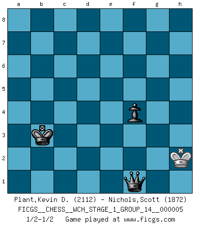 Last move : 1/2-1/2 2008 October 8 22:41:11 [Event "FICGS__CHESS__WCH_STAGE_1_GROUP_14__000005"] [Site "FICGS"] [Date "2008.07.08"] [Round "1"] [White "Plant,Kevin D."] [Black "Nichols,Scott"] [Result "1/2-1/2"] [WhiteElo "2112"] [BlackElo "1872"] 1.e4 d6 2.Nc3 Nf6 3.Nf3 g6 4.d4 Bg7 5.Be2 O-O 6.O-O c6 7.h3 Nbd7 8.a4 e5 9.dxe5 Nxe5 10.Bf4 Qe7 11.Qd2 Rd8 12.Bg5 Be6 13.a5 Bc4 14.Bxc4 Nxc4 15.Qe2 Ne5 16.Nd4 Qc7 17.a6 b6 18.Na2 Re8 19.Bxf6 Bxf6 20.Nb4 b5 21.c3 Rac8 22.Rad1 Qb6 23.f4 Nd7 24.Qf3 Bg7 25.f5 Ne5 26.Qf4 d5 27.Kh1 dxe4 28.Qxe4 Qb8 29.Ndc2 Nc4 30.Qf3 Ne5 31.Qe4 Nc4 32.Qf3 Ne5 33.Qf4 Rcd8 34.Nd4 Qc8 35.f6 Bf8 36.Rde1 c5 37.Rxe5 Rxe5 38.Qxe5 cxb4 39.Qxb5 bxc3 40.Nc6 c2 41.Qc4 Kh8 42.Qxc2 Qxa6 43.Re1 Rc8 44.Rc1 h5 45.Qe4 Bh6 46.Rc4 Kh7 47.Ne5 Re8 48.Qc6 Qa1+ 49.Kh2 Be3 50.Nf3 Re6 51.Qa4 Qxb2 52.Qxa7 Qxf6 53.Qb8 g5 54.Qb1+ Kg7 55.Qc2 Bf4+ 56.g3 Re3 57.Qd1 Be5 58.Kg2 Qe6 59.Nxe5 Qxe5 60.Qd4 Rxg3+ 61.Kh2 Qxd4 62.Rxd4 Rc3 63.Rd5 Kg6 64.Rd4 f5 65.Rd6+ Kg7 66.Kg2 Rc2+ 67.Kg1 g4 68.hxg4 hxg4 69.Ra6 Rc4 70.Kg2 f4 71.Kh2 g3+ 72.Kh3 Rc2 73.Ra1 Kf6 74.Kg4 Rf2 75.Kh3 Ke5 76.Ra5+ Kd4 77.Ra4+ Kd3 78.Ra3+ Kc4 79.Ra4+ Kb3 80.Ra1 g2 81.Kh2 Rf1 82.Rxf1 gxf1Q 1/2-1/2 King's pawn Opening Kingside Castling by player Black (move 5) Kingside Castling by player White (move 6) 10 pieces endgame at move 60 : White KQRP , Black KQRPPP WHITE : King + 1 Queen 1 Rook 1 Pawn BLACK : King + 1 Queen 1 Rook 3 Pawns 9 pieces endgame at move 61 : White KRP , Black KQRPPP WHITE : King + 1 Rook 1 Pawn BLACK : King + 1 Queen 1 Rook 3 Pawns 8 pieces endgame at move 62 : White KRP , Black KRPPP WHITE : King + 1 Rook 1 Pawn BLACK : King + 1 Rook 3 Pawns 7 pieces endgame at move 68 : White KRP , Black KRPP WHITE : King + 1 Rook 1 Pawn BLACK : King + 1 Rook 2 Pawns 6 pieces endgame at move 68 : White KR , Black KRPP WHITE : King + 1 Rook BLACK : King + 1 Rook 2 Pawns 5 pieces endgame at move 82 : White KR , Black KPP WHITE : King + 1 Rook BLACK : King + 2 Pawns Promotion Queen by player Black (move 82) 4 pieces endgame at move 82 : White K , Black KQP WHITE : King + BLACK : King + 1 Queen 1 Pawn This chess game ended in a draw. Follow this game move after move (download)Half the variations which are calculated in a tournament game turn out to be completely superfluous. Unfortunately, no one knows in advance which half. (Jan Tinman) Der 70jährige Viktor Kortschnoi: Die Rentenanstalt wollte mich zwingen in Rente zu gehen. Meine Frau erhält jetzt eine Pension- und ich zahle weiter in die Rentenkasse ein! (Viktor Kortschnoi) Un sacrificio se refuta mucho mejor al aceptarlo. (Wilhelm Steinitz) Toute estimation doit être constamment réévaluée. (Jacob Estrin) In theory there is no difference between theory and practice. In practice there is. (Yogi Berra)