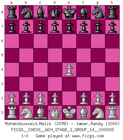 Last move : 1-0 2008 August 8 5:18:8 [Event "FICGS__CHESS__WCH_STAGE_1_GROUP_14__000005"] [Site "FICGS"] [Date "2008.07.08"] [Round "1"] [White "Mohandoussaid,Malik"] [Black "Jamar,Randy"] [Result "1-0"] [WhiteElo "2098"] [BlackElo "1000"] 1.e4 1-0 This chess game has been lost on time (started : 2008.07.08 16:32:21) King's pawn Opening Player White won this chess game. Follow this game move after move (download)If your opponent cannot do anything active, then don't rush the position; instead you should let him sit there, suffer, and beg you for a draw. (Jeremy Silman) Er war ein guter Schachspieler, aber ich kann Leute nicht ausstehen, die 'Heil Hitler' rufen (Über Alexander Aljechin). (Miguel Najdorf) No hay un Gran Maestro de Ajedrez que sea normal; solo se diferencían ellos por la magnitud de su locura. (Viktor Korchnoi) Toutes les manuvres exécutées sur une colonne ouverte ont pour but ultime l'intrusion définitive sur la septième ou la huitième rangée, en plein cur de la position ennemie. (Aaron Nimzovitch) It's unlucky to be superstitious. (Dave Enteles)