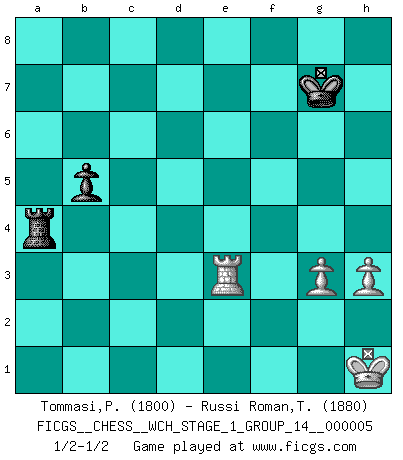Last move : 1/2-1/2 2009 January 30 3:3:54 [Event "FICGS__CHESS__WCH_STAGE_1_GROUP_14__000005"] [Site "FICGS"] [Date "2008.07.08"] [Round "1"] [White "Tommasi,Paride"] [Black "Russi Roman,Tano-Urayoan"] [Result "1/2-1/2"] [WhiteElo "1800"] [BlackElo "1880"] 1.e4 c5 2.Nf3 e6 3.d4 cxd4 4.Nxd4 Qb6 5.Nb3 Nf6 6.Bd3 Qc7 7.O-O d6 8.f4 Nbd7 9.Be3 a6 10.a4 b6 11.Nc3 Bb7 12.Qf3 Be7 13.Qh3 h5 14.f5 e5 15.Qg3 O-O 16.h3 Rfc8 17.Rfd1 Bf8 18.Nd2 d5 19.exd5 Bxd5 20.Nde4 Bc6 21.Ng5 Bb4 22.Bc4 Rf8 23.Ne6 fxe6 24.fxe6 Kh8 25.exd7 Bxc3 26.bxc3 Bxd7 27.Bb3 Bf5 28.Rf1 Qxc3 29.Qe1 Qc8 30.Qe2 Rb8 31.Bf2 Be4 32.Bg3 Qc3 33.Kh2 Rbc8 34.Bh4 Bxc2 35.Bxf6 Qxb3 36.Qxh5+ Kg8 37.Qg4 Qf7 38.Bxg7 Qxg7 39.Rxf8+ Rxf8 40.Qc4+ Kh8 41.Qxc2 e4 42.Re1 Qe5+ 43.Kg1 Qd4+ 44.Kh1 Qe5 45.Qc1 Rf6 46.Qc8+ Kg7 47.Qxa6 e3 48.Qb5 Qe4 49.Qb1 Qc4 50.Qc1 Qxc1 51.Rxc1 Rf4 52.Re1 Rxa4 53.Rxe3 b5 54.g3 1/2-1/2 Sicilian defense Kingside Castling by player White (move 7) Kingside Castling by player Black (move 15) 10 pieces endgame at move 50 : White KRPPP , Black KQRPP WHITE : King + 1 Rook 3 Pawns BLACK : King + 1 Queen 1 Rook 2 Pawns 9 pieces endgame at move 51 : White KRPPP , Black KRPP WHITE : King + 1 Rook 3 Pawns BLACK : King + 1 Rook 2 Pawns 8 pieces endgame at move 52 : White KRPP , Black KRPP WHITE : King + 1 Rook 2 Pawns BLACK : King + 1 Rook 2 Pawns 7 pieces endgame at move 53 : White KRPP , Black KRP WHITE : King + 1 Rook 2 Pawns BLACK : King + 1 Rook 1 Pawn This chess game ended in a draw. Follow this game move after move (download)My God, Bobby Fischer plays so simply. (Alexei Suetin) Ich habe kein Problem mit Frauen, sondern nur mit dem Niveau ihres Schachspiels (Judith Polgar) Creo que una cierta cantidad de temperamento es esperada de los genios del Ajedrez. (Ron Gross) Le profane ne songe pas à la somme de jouissance dont il se prive, qui méconnaît ce jeu aux ressources aussi variées que passionnantes. (Jean-Marie Jeanton-Lamarche) Two beer, or not two beer. (Unknown)