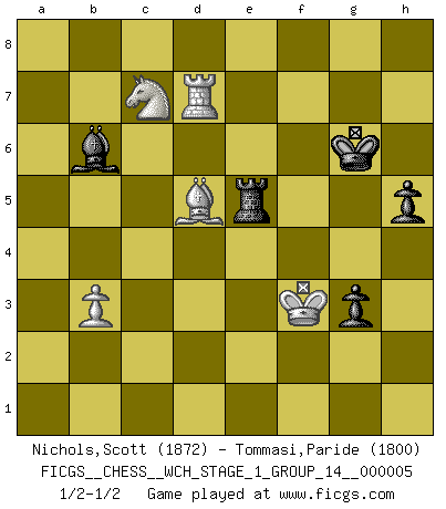 Last move : 1/2-1/2 2008 August 14 11:25:34 [Event "FICGS__CHESS__WCH_STAGE_1_GROUP_14__000005"] [Site "FICGS"] [Date "2008.07.08"] [Round "1"] [White "Nichols,Scott"] [Black "Tommasi,Paride"] [Result "1/2-1/2"] [WhiteElo "1872"] [BlackElo "1800"] 1.e4 g6 2.d4 d6 3.Nc3 Bg7 4.Nf3 Nf6 5.Be2 O-O 6.O-O c6 7.h3 Nbd7 8.a4 e5 9.dxe5 dxe5 10.Qd6 Re8 11.Bc4 Bf8 12.Qd3 Qe7 13.Ng5 Nc5 14.Qg3 Be6 15.Nxe6 Nxe6 16.Qxe5 Qb4 17.b3 Bg7 18.Ba3 Qb6 19.a5 Qd4 20.Qxd4 Nxd4 21.Rad1 Nxc2 22.Bb2 b5 23.axb6 axb6 24.e5 Rxe5 25.Rd6 Nb4 26.Na4 Re7 27.Bxf6 Bxf6 28.Nxb6 Be5 29.Rxc6 Nxc6 30.Nxa8 Bd4 31.Rd1 Ba7 32.Kf1 Nd4 33.Ra1 Rb7 34.Bd5 Rd7 35.Ra5 Kg7 36.g3 h5 37.h4 Nc2 38.Be4 Rd1+ 39.Ke2 Re1+ 40.Kd2 Bxf2 41.Bxc2 Bxg3 42.Ra7 Bxh4 43.Bd3 Re5 44.Bc4 Be7 45.Nc7 Bc5 46.Ra1 g5 47.Rf1 g4 48.Rxf7+ Kg6 49.Rd7 g3 50.Bd5 Be3+ 51.Ke2 Bb6 52.Kf3 1/2-1/2 Robatsch (Modern) defense Kingside Castling by player Black (move 5) Kingside Castling by player White (move 6) 10 pieces endgame at move 48 : White KRBNP , Black KRBPP WHITE : King + 1 Rook 1 Bishop 1 Knight 1 Pawn BLACK : King + 1 Rook 1 Bishop 2 Pawns This chess game ended in a draw. Follow this game move after move (download)Examine moves that smite! A good eye for smites is far more important than a knowledge of strategical principles. (Purdy) Schach ist ein Teil der Kultur, und wenn es mit der Kultur abwärts geht, geht es auch mit dem Schach abwärts. (Mikhail Moiseyevich Botvinik) El Ajedrez te enseña a controlarl la excitación inicial que sientes cuando vez algo que parece bueno y te enseña a pensar objetivamente cuando te encuentras en problemas. (Stanley Kubrick) J'ai toujours senti une vague pitié pour l'homme qui ne connaît rien aux échecs, tout comme j'en aurais pour un homme ignorant de l'amour. Les Echecs, comme la musique ou comme l'amour, ont le pouvoir de rendre heureux. (Siegbert Tarrasch) The existence of forgetting has never been proved: We only know that some things don't come to mind when we want them. (Friedrich Nietzsche)