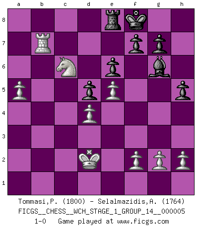 Last move : 1-0 2008 July 24 12:11:13 [Event "FICGS__CHESS__WCH_STAGE_1_GROUP_14__000005"] [Site "FICGS"] [Date "2008.07.08"] [Round "1"] [White "Tommasi,Paride"] [Black "Selalmazidis,Arsenis"] [Result "1-0"] [WhiteElo "1800"] [BlackElo "1764"] 1.e4 e6 2.d4 d5 3.Nc3 Nf6 4.Bg5 Be7 5.e5 Ne4 6.Bxe7 Nxc3 7.Bxd8 Nxd1 8.Bxc7 Nxb2 9.Rb1 Na4 10.Bb5+ Bd7 11.Bxa4 Bxa4 12.Rxb7 O-O 13.Ne2 Rc8 14.Nc3 Bxc2 15.Kd2 Bg6 16.Nb5 Na6 17.Rc1 Nxc7 18.Nxa7 Rab8 19.R1xc7 Re8 20.a4 Rxb7 21.Rxb7 h5 22.Nc6 Kf8 23.a5 1-0 Comment by player 2 : Arsenis Selalmazidis : the problem with this game was that i didn't see 14. Nc3 !! coming , completely driwing away my bishop from the battle ! if i would play 13... Bxc2 right away , then i guess it could go at some point to c4 , from where it dominates !! well done tommasi ! also, i would like to mention that 7. Qg4! is strong !!! French : Classical, Tartakower variation Kingside Castling by player Black (move 12) Player White won this chess game. Follow this game move after move (download)Chess is a beautiful mistress. (Bent Larsen) Ich suche im Schach immer etwas Eigenes. Riskantes Spiel im Stile schachlicher Musketiere ist nicht meine Sache, auch wenn es vielen Freunden scharfer Wendungen gefällt. (Anatoly Karpov) ¿Que sería del Ajedrez sin errores graciosos?. (Kurt Richter) Karpov est une pièce de musée. (Garry Kasparov) Logic : The art of thinking and reasoning in strict accordance with the limitations and incapacities of the human misunderstanding. (Ambrose Bierce)