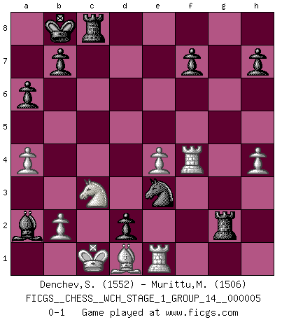 Last move : 0-1 2008 September 1 9:1:29 [Event "FICGS__CHESS__WCH_STAGE_1_GROUP_14__000005"] [Site "FICGS"] [Date "2008.07.08"] [Round "1"] [White "Denchev,Stanimir"] [Black "Murittu,Massimiliano"] [Result "0-1"] [WhiteElo "1552"] [BlackElo "1506"] 1.d4 d5 2.c4 e5 3.cxd5 Qxd5 4.Nc3 Qxd4 5.Qxd4 exd4 6.Nb5 Bb4+ 7.Bd2 Bxd2+ 8.Kxd2 Na6 9.Nxd4 c5 10.Nb5 Be6 11.e4 O-O-O 12.Kc3 Nf6 13.f3 Nb4 14.a3 Nc6 15.a4 g5 16.Bd3 g4 17.Ne2 a6 18.Na3 gxf3 19.gxf3 Ne5 20.Bc2 Nxf3 21.Rhf1 Nd4 22.Nxd4 cxd4+ 23.Kd3 Ng4 24.Rac1 Kb8 25.h4 Ne5+ 26.Kd2 Rhg8 27.Rf2 Rg3 28.Rh1 Ng4 29.Rf4 Rg2+ 30.Kc1 d3 31.Bd1 Ba2 32.Nb1 Rc8+ 33.Nc3 Ne3 34.Re1 d2+ 0-1 QGD : Albin counter-gambit Queenside Castling by player Black (move 11) Player Black won this chess game. Follow this game move after move (download)Bobby Fischer's current state of mind is indeed a tragedy. One of the world's greatest Chess players - the pride and sorrow of American Chess. (Frank Brady) Strategie ist, wie man ein Mädchen auf den Rücksitz bekommt. Taktik ist, was man tut, wenn man dann dort ist. (Anonymous) Una de estas pequeñas movidas modestas pudieran ser mas molestas a tu oponente que la amenaza mas grande. (Siegbert Tarrasch) Les Echecs sont affaire de jugement sensible. Savoir quand frapper et quand esquiver. (Fischer) You think that education is too expensive ? Try ignorance. (Derek Bok)