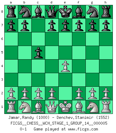 Last move : 0-1 2008 August 9 17:25:54 [Event "FICGS__CHESS__WCH_STAGE_1_GROUP_14__000005"] [Site "FICGS"] [Date "2008.07.08"] [Round "1"] [White "Jamar,Randy"] [Black "Denchev,Stanimir"] [Result "0-1"] [WhiteElo "1000"] [BlackElo "1552"] 1.e4 c5 0-1 This chess game has been lost on time (started : 2008.07.08 16:32:21) Sicilian defense Player Black won this chess game. Follow this game move after move (download)Chess, like any creative activity, can exist only through the combined efforts of those who have creative talent, and those who have the ability to organize their creative work. (Mikhail Botvinnik) Wenn ein Kopf und ein Buch zusammenstoßen und es klingt hohl, ist es denn allemal im Buche? (Georg Christoph Lichtenberg) Prefiero perder una partida realmente buena, que ganar una mala. (David Levy) Karpov est une pièce de musée. (Garry Kasparov) The human is the only animal species whose members are able to talk themselves into difficulties that would not otherwise exist. (Wendell Johnson)