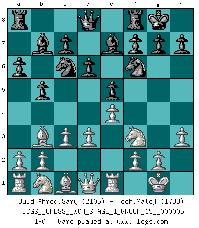 Last move : 1-0 2008 October 20 0:18:13 [Event "FICGS__CHESS__WCH_STAGE_1_GROUP_15__000005"] [Site "FICGS"] [Date "2008.07.08"] [Round "1"] [White "Ould Ahmed,Samy"] [Black "Pech,Matej"] [Result "1-0"] [WhiteElo "2105"] [BlackElo "1783"] 1.e4 e5 2.Nf3 Nc6 3.Bb5 a6 4.Ba4 Nf6 5.O-O Be7 6.Re1 b5 7.Bb3 d6 8.c3 O-O 9.h3 Bb7 10.d3 1-0 This chess game has been lost on time (started : 2008.07.08 16:33:56) Ruy Lopez : Closed Kingside Castling by player White (move 5) Kingside Castling by player Black (move 8) Player White won this chess game. Follow this game move after move (download)Chess books should be used as we use glasses: to assist the sight, although some players make use of them as if they thought they conferred sight. (Jose Raul Capablanca) Wenn sie aufgeben, dann danke ich Ihnen für das Spiel (Eventualzug beim Fernschach). (Anonymous) Diferente gente reacciona diferentemente en aceptar la derrota. (Bobby Fischer) Je fais ceci parce que dans cinquante coups j'obtiendrai cela; je m'appelle Mikhail Moisevitch Botvinnik. (Botvinnik) Be who you are, and say what you feel because those who mind don't matter, and those who matter don't mind. (Dr Seuss)