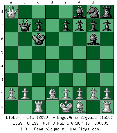 Last move : 1-0 2008 August 12 12:11:52 [Event "FICGS__CHESS__WCH_STAGE_1_GROUP_15__000005"] [Site "FICGS"] [Date "2008.07.08"] [Round "1"] [White "Bleker,Frits"] [Black "Engo,Arne Sigvald"] [Result "1-0"] [WhiteElo "2099"] [BlackElo "1550"] 1.d4 d5 2.Nf3 Nc6 3.c4 Bf5 4.cxd5 Qxd5 5.Nc3 Qa5 6.Bd2 Nxd4 7.Nxd4 Bg6 8.Ncb5 Qb6 9.Qa4 O-O-O 10.Nxa7+ Kb8 11.Ndc6+ bxc6 12.Nxc6+ Kc8 13.Qa8+ Kd7 14.Qxd8+ Kxc6 15.Qa8+ Qb7 16.Rc1+ 1-0 Queen's pawn game, Chigorin variation Queenside Castling by player Black (move 9) Player White won this chess game. Follow this game move after move (download)Good offense and good defense both begin with good development. (Bruce A. Moon) Obendrein hat der FIDE-Präsident den Revolutionsführer Gaddafi zum »Großmeister« ernannt, am Ende der WM. Das ist lächerlich! (Joel Lautier) Vive, pierde y aprende al observar a tu oponente como gana. (Amber Steenbock) Roi des jeux et jeu des rois, les échecs portent en eux un sentiment d'infini. Ils donnent à celui qui s'est efforcé d'en approfondir les arcanes l'impression de n'être pas à la mesure de l'homme; en fait, ils constituent un résumé de l'univers, un microcosme, et figurent cette grande échelle qui, dans les plans de la lumière descend jusqu'à la matière, qui des abîmes insondables remonte jusqu'en l'infini de Dieu. (Pyrame) If you are going through hell, keep going. (Winston Churchill)