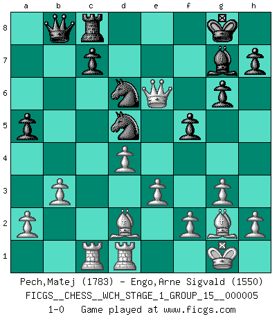 Last move : 1-0 2008 September 26 16:58:57 [Event "FICGS__CHESS__WCH_STAGE_1_GROUP_15__000005"] [Site "FICGS"] [Date "2008.07.08"] [Round "1"] [White "Pech,Matej"] [Black "Engo,Arne Sigvald"] [Result "1-0"] [WhiteElo "1783"] [BlackElo "1550"] 1.c4 g6 2.Nc3 Bg7 3.g3 Nc6 4.Bg2 e6 5.Nf3 Nge7 6.O-O O-O 7.d4 d5 8.e3 dxc4 9.Qa4 b5 10.Qxb5 Bd7 11.Qxc4 a5 12.Rd1 Na7 13.Ne5 Rb8 14.b3 Bb5 15.Nxb5 Nxb5 16.Bd2 Nd6 17.Qa4 f6 18.Nd7 f5 19.Nxb8 Qxb8 20.Rac1 Rc8 21.Qd7 Nd5 22.Qxe6+ 1-0 English Opening Kingside Castling by player White (move 6) Kingside Castling by player Black (move 6) Player White won this chess game. Follow this game move after move (download)My style is somewhere between that of Tal and Petrosian. (Reshevsky) Es ist besser die Steine des Gegners zu opfern. (Savielly Grigorievitsch Tartakower) Aún el Rey más flojo huye despavorido ante la amenaza de un Jaque doble. (Aaron Nimzowitsch) La victoire dans une partie d'Echecs appartient la plupart du temps à celui qui voit un peu plus loin que l'adversaire. (Lasker) In my experience, there's no such thing as luck. (Obi-Wan Kenobi in Star Wars ep.4)