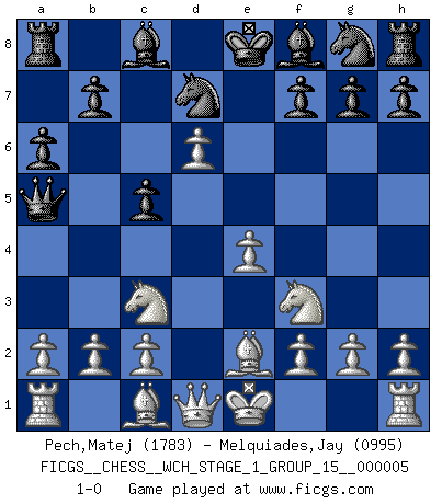 Last move : 1-0 2008 September 17 22:0:14 [Event "FICGS__CHESS__WCH_STAGE_1_GROUP_15__000005"] [Site "FICGS"] [Date "2008.07.08"] [Round "1"] [White "Pech,Matej"] [Black "Melquiades,Jay"] [Result "1-0"] [WhiteElo "1783"] [BlackElo "0995"] 1.e4 e5 2.Nf3 d6 3.d4 a6 4.dxe5 c5 5.Nc3 Qa5 6.exd6 Nd7 7.Be2 1-0 This chess game has been lost on time (started : 2008.07.08 16:33:56) Philidor's defense Player White won this chess game. Follow this game move after move (download)Bobby is the most misunderstood, misquoted celebrity walking the face of this earth. (Yasser Seirawan) Sicherlich können nur Meister einen Stil haben. Daß ein nicht-Meister auch nur ein einziges Mal in seinem Leben eine Partie folgerecht durchführte, habe ich niemals bemerkt. (Emanuel Lasker) Ciertamente, de todas la drogas del mundo, el Ajedrez debe ser el mas placentero permamentemente. (Assiac) Roi des jeux et jeu des rois, les échecs portent en eux un sentiment d'infini. Ils donnent à celui qui s'est efforcé d'en approfondir les arcanes l'impression de n'être pas à la mesure de l'homme; en fait, ils constituent un résumé de l'univers, un microcosme, et figurent cette grande échelle qui, dans les plans de la lumière descend jusqu'à la matière, qui des abîmes insondables remonte jusqu'en l'infini de Dieu. (Pyrame) There are two kinds of tragedy in this world, one is not getting what you want and the other is getting. (Lord of war)