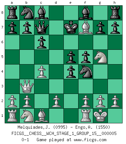 Last move : 0-1 2008 September 11 9:35:43 [Event "FICGS__CHESS__WCH_STAGE_1_GROUP_15__000005"] [Site "FICGS"] [Date "2008.07.08"] [Round "1"] [White "Melquiades,Jay"] [Black "Engo,Arne Sigvald"] [Result "0-1"] [WhiteElo "0995"] [BlackElo "1550"] 1.e4 c6 2.Nf3 d5 3.Be2 dxe4 4.Ng5 f5 5.c3 e5 6.Qb3 Qc7 7.Bc4 Nf6 8.Bf7+ Ke7 9.O-O Nd5 10.c4 Nf4 0-1 This chess game has been lost on time (started : 2008.07.08 16:33:56) Caro-Kann defense Kingside Castling by player White (move 9) Player Black won this chess game. Follow this game move after move (download)Chess is no whit inferior to the violin, and we have a large number of professional violinists. (Mikhail Botvinnik) Wie bekannt hörte Morphy 1859 auf, Schach zu spielen. Seine Enttäuschung galt nicht so sehr dem Schach, wie den Schachspielern. (Robert James Fischer) La pasion por jugar al Ajedrez es una de las mas inexplicables en el mundo. (H.G. Wells) On peut tirer plus d'utilité d'une partie perdue que de 100 parties gagnées. (Capablanca) Establishing goals is all right if you don't let them deprive you of interesting detours. (Doug Larson)