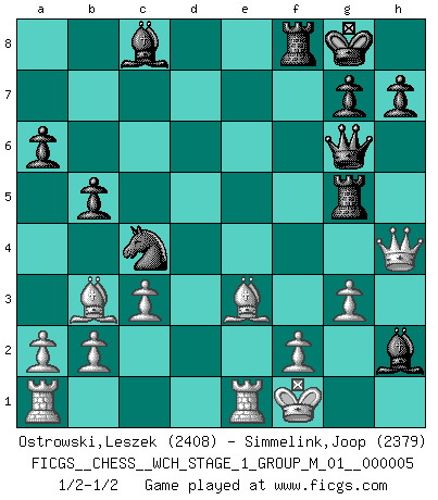 Last move : 1/2-1/2 2008 August 4 17:38:8 [Event "FICGS__CHESS__WCH_STAGE_1_GROUP_M_01__000005"] [Site "FICGS"] [Date "2008.07.08"] [Round "1"] [White "Ostrowski,Leszek"] [Black "Simmelink,Joop"] [Result "1/2-1/2"] [WhiteElo "2408"] [BlackElo "2379"] 1.e4 e5 2.Nf3 Nc6 3.Bb5 a6 4.Ba4 Nf6 5.O-O Be7 6.Re1 b5 7.Bb3 d6 8.c3 O-O 9.h3 Na5 10.Bc2 d5 11.d4 dxe4 12.Nxe5 c5 13.Be3 Bb7 14.Nd2 Qc7 15.Qb1 cxd4 16.Bxd4 Bd6 17.Ng4 Nxg4 18.hxg4 Bh2+ 19.Kh1 f5 20.gxf5 Bf4 21.Nxe4 Rxf5 22.Qd1 Qc6 23.Qg4 Qh6+ 24.Kg1 Bh2+ 25.Kf1 Raf8 26.g3 Nc4 27.Bb3 Bc8 28.Be3 Qc6 29.Qh4 Qg6 30.Ng5 Rxg5 1/2-1/2 Ruy Lopez : Closed Kingside Castling by player White (move 5) Kingside Castling by player Black (move 8) This chess game ended in a draw. Follow this game move after move (download)I love all positions. Give me a difficult positional game, I will play it. But totally won positions, I cannot stand them. (Hein Donner) Ich trinke, ich rauche, ich spiele, ich liebe Frauen aber Fernschach ist ein Laster, das ich nicht habe. (Mikhail Nekhemyevich Tal) Cuando tengas duda... ¡juega al Ajedrez!. (Tevis) Des points faibles ou des trous dans la position de l'adversaire doivent être occupés par des pièces et non pas par des pions. (Siegbert Tarrasch) See no evil, hear no evil, speak no evil. (The 3 monkeys)