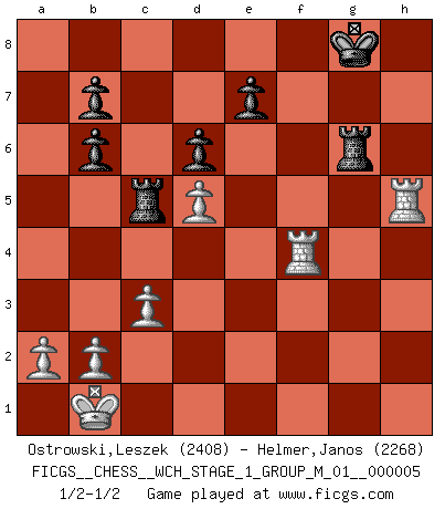 Last move : 1/2-1/2 2008 October 16 16:32:16 [Event "FICGS__CHESS__WCH_STAGE_1_GROUP_M_01__000005"] [Site "FICGS"] [Date "2008.07.08"] [Round "1"] [White "Ostrowski,Leszek"] [Black "Helmer,Janos"] [Result "1/2-1/2"] [WhiteElo "2408"] [BlackElo "2268"] 1.e4 c5 2.Nf3 d6 3.d4 cxd4 4.Nxd4 Nf6 5.Nc3 g6 6.Be3 Bg7 7.f3 O-O 8.Qd2 Nc6 9.O-O-O Bd7 10.g4 Rc8 11.h4 Ne5 12.Kb1 h5 13.g5 Ne8 14.Be2 Nc7 15.f4 Ng4 16.f5 Nxe3 17.Qxe3 Na8 18.Nd5 Nb6 19.fxg6 fxg6 20.c3 Kh7 21.Rhg1 Bxd4 22.Qxd4 Nxd5 23.exd5 Qb6 24.Qxb6 axb6 25.Rge1 Rc7 26.Bd3 Bg4 27.Rf1 Rf3 28.Be4 Rh3 29.Rf7+ Kg8 30.Rdf1 Bf5 31.Bxf5 gxf5 32.g6 Rxh4 33.R1xf5 Rg4 34.Rxh5 Rxg6 35.Rf4 Rc5 1/2-1/2 Sicilian : Dragon, Yugoslav attack, 7...O-O Kingside Castling by player Black (move 7) Queenside Castling by player White (move 9) This chess game ended in a draw. Follow this game move after move (download)A big shock; the best chess player in history has passed away. (Lajos Portisch, about Bobby Fischer's death) In Buenos Aires ist es nicht mein vorrangiges Ziel ein starkes Turnier zu organisieren, sondern ein Turnier für Gentlemen. Ich würde nie Kamsky einladen. Ich mag keine Probleme. (Miguel Najdorf) Preferería tener un Peón que un dedo. (Reuben Fine) Toutes les manuvres exécutées sur une colonne ouverte ont pour but ultime l'intrusion définitive sur la septième ou la huitième rangée, en plein cur de la position ennemie. (Aaron Nimzovitch) You can only get smarter by playing a smarter opponent. (Revolver, movie)