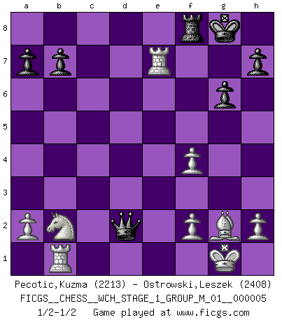 Last move : 1/2-1/2 2008 August 11 15:52:20 [Event "FICGS__CHESS__WCH_STAGE_1_GROUP_M_01__000005"] [Site "FICGS"] [Date "2008.07.08"] [Round "1"] [White "Pecotic,Kuzma"] [Black "Ostrowski,Leszek"] [Result "1/2-1/2"] [WhiteElo "2213"] [BlackElo "2408"] 1.Nf3 Nf6 2.c4 g6 3.g3 Bg7 4.d4 d5 5.Bg2 O-O 6.cxd5 Nxd5 7.O-O Nb6 8.Nc3 Nc6 9.d5 Na5 10.e4 c6 11.Bf4 cxd5 12.exd5 Nac4 13.Qe2 Nxb2 14.Qxb2 Na4 15.Nxa4 Bxb2 16.Nxb2 Qxd5 17.Rfe1 Be6 18.Ng5 Qd4 19.Nxe6 fxe6 20.Rab1 Rxf4 21.gxf4 Rf8 22.Rxe6 Qd2 23.Rxe7 1/2-1/2 Reti Opening Kingside Castling by player Black (move 5) Kingside Castling by player White (move 7) This chess game ended in a draw. Follow this game move after move (download)The tactician knows what to do when there is something to do; whereas the strategian knows what to do when there is nothing to do. (Gerald Abrahams) Der Bart als Geschlechtszeichen mitten im Gesicht ist obszön. Daher gefällt er den Weibern. [Zugegeben, kein Schachzitat, aber unglaublich originell] (Arthur Schopenhauer) Me dio la sensación de como si yo estuviera jugando en contra del mismo Ajedrez. - al estar jugando en contra de Robert Fischer (Walter Shipman) Lorsque vous vous retrouvez devant une position atroce, ne tendez pas un ultime piège dérisoire avec l'intention d'abandonner si l'adversaire le déjoue ! Faites-vous plutôt un devoir de résister comme si votre vie en dépendait. Jouez le coup qui vous déplairait au centuple si vous étiez dans la peau de votre tortionnaire ! Patience, use the Force, think ! (Obi-Wan Kenobi in Star Wars ep.2)